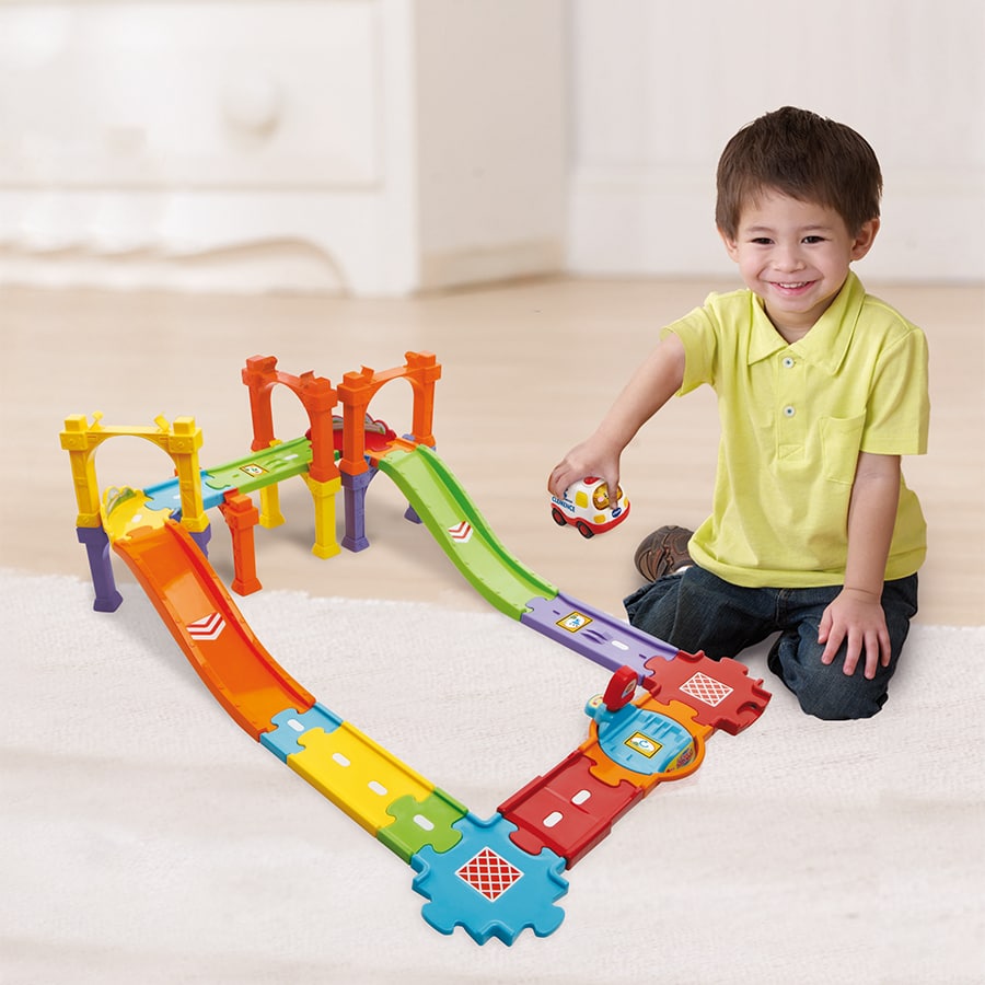 Combiner les différentes pistes et faire rouler les Tut Tut Bolides (vendus séparément) exerce la motricité.